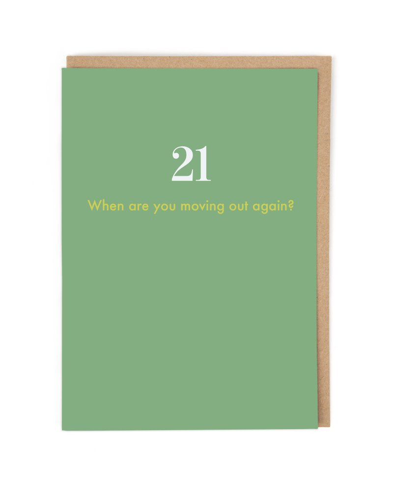 “When are you moving out again?” 21st birthday card from the Deadpan range.