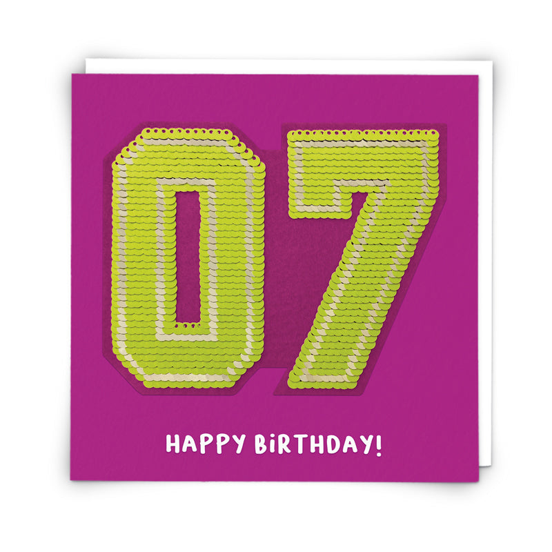 A hand finished birthday card illustrated by Nicola Watson. The image shows the number '7' in red, on a yellow and blue stripe background with an explosive, comic book style.