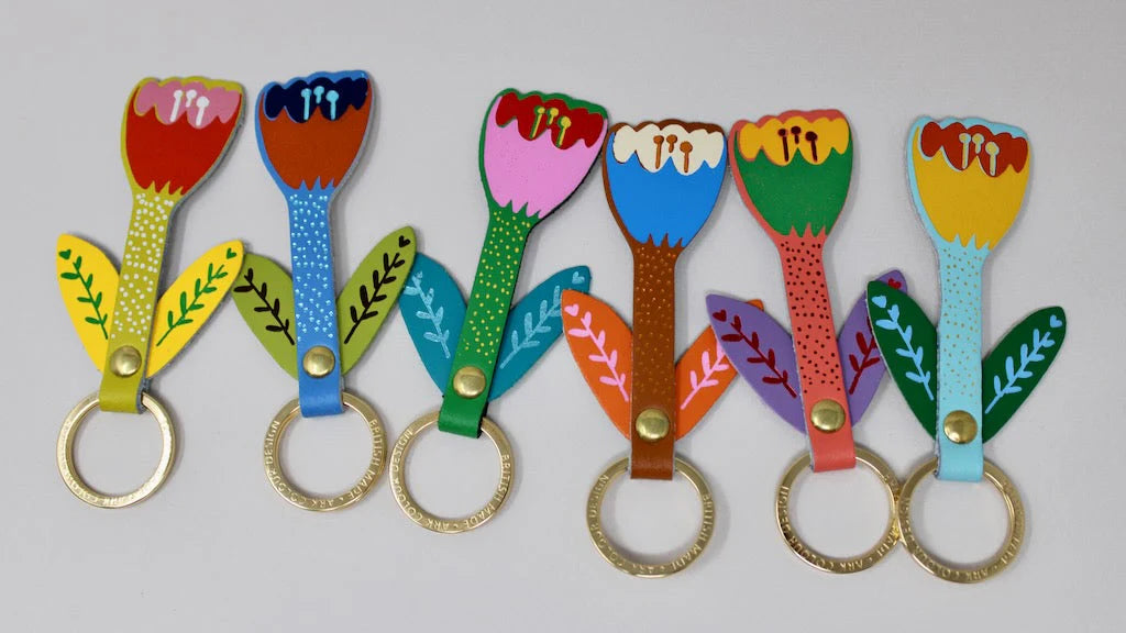 When the key to your heart is flowers  Double layered key fob Genuine leather with gold plated ring Made in Scotland Height 10cm