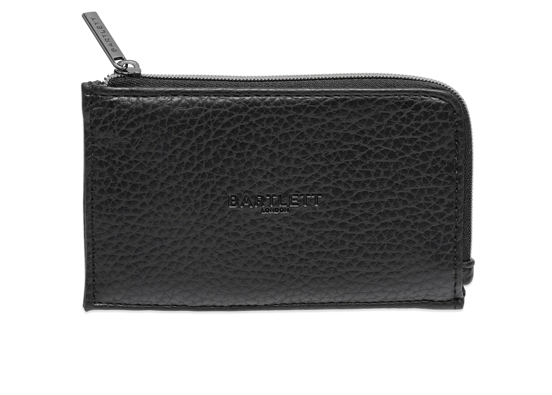 Introducing the Bartlett Men's Zipped Card Holder, expertly crafted in durable black material. With a zip closure, this card holder offers secure storage for your cards while maintaining a sleek and professional look. Stay organized and stylish with this must-have accessory.
