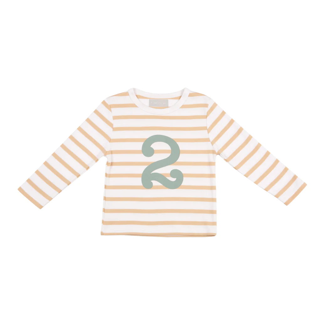 Biscuit & white breton striped cotton T shirt, featuring a green number 2 screen print.