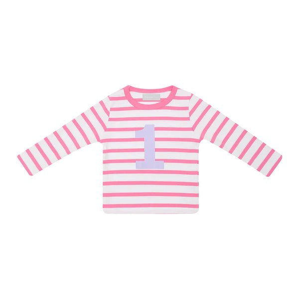Hot pink & white breton striped cotton T shirt, featuring a lilac number 1 screen print. Long Sleeves only.
