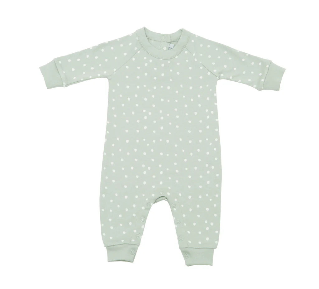 Moss grey and white spot print cotton all-in-one.