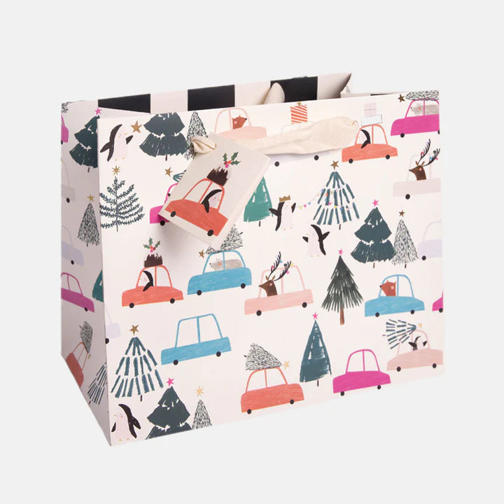 Add that special finishing touch to your gift giving this year with this festive animals in cars Christmas gift bag. Printed on thick card, our gift bag materials are responsibly sourced from sustainable forests and recyclable (excluding fabric handles).