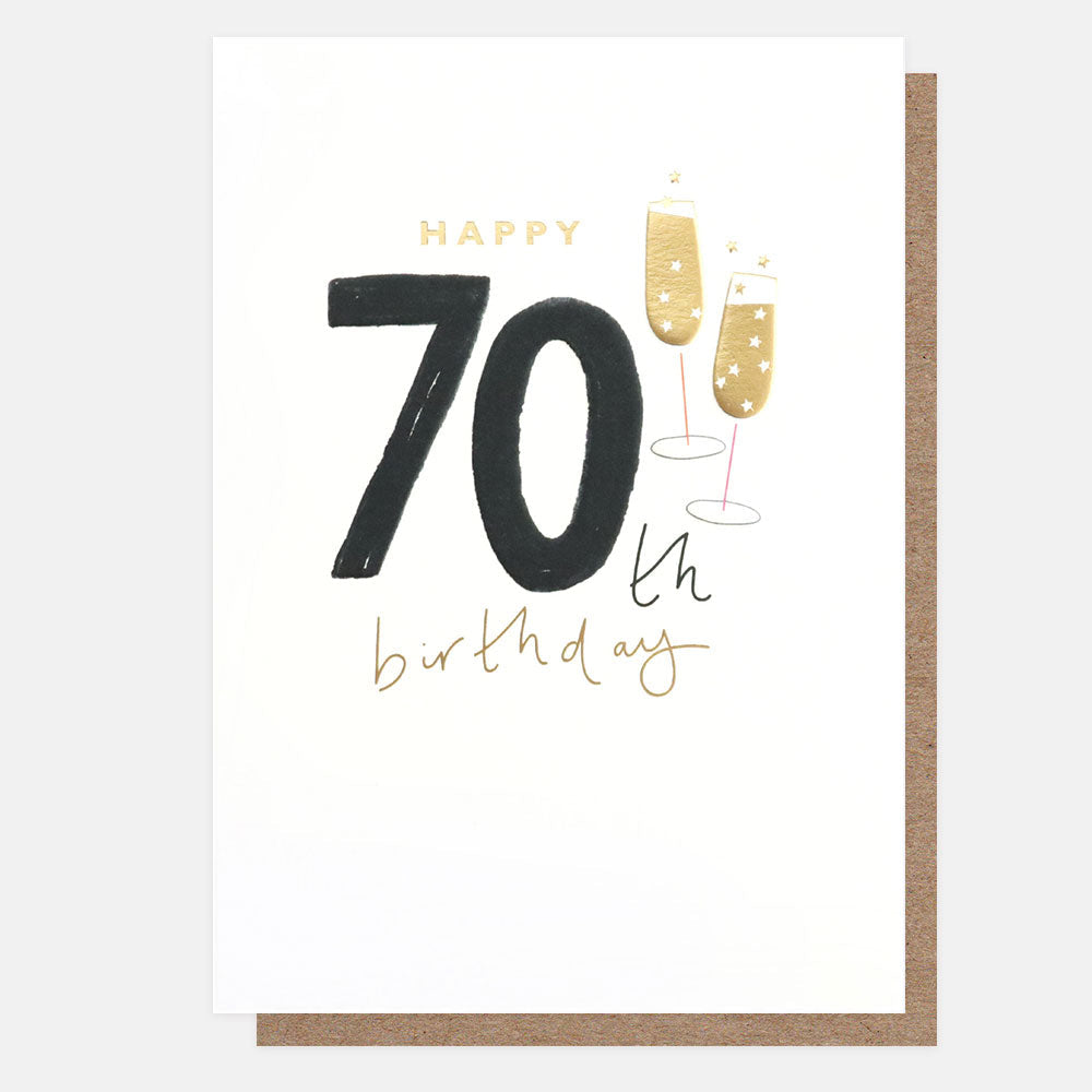 Beautiful 70th birthday card for the special person in your life. This card is gold foiled with delicate embossing and comes with a kraft envelope for that added touch of decadence.