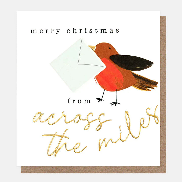 Even if you are far away, wish them the merriest of Christmases with this cute robin holding an envelope 'merry from across the miles' card. Featuring gold foil lettering and embossing and left blank inside for you to write you own personal message.