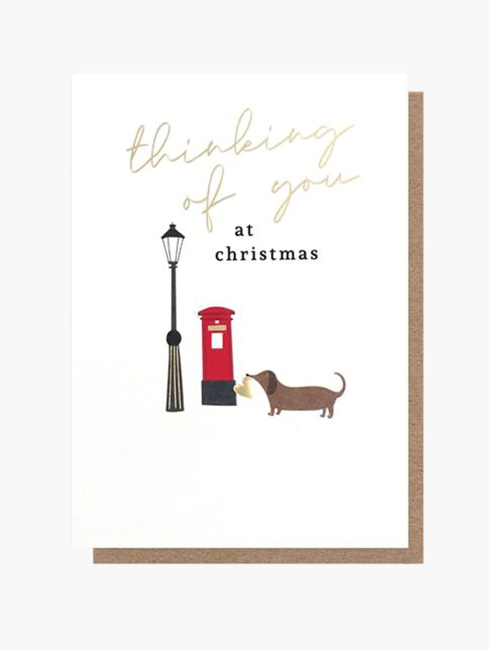 Let them know you are thinking of them this Christmastime with this cute sausage dog posting a gold heart Christmas card. Featuring gold foil lettering and embossing and a message inside saying 'merry christmas and a happy new year'