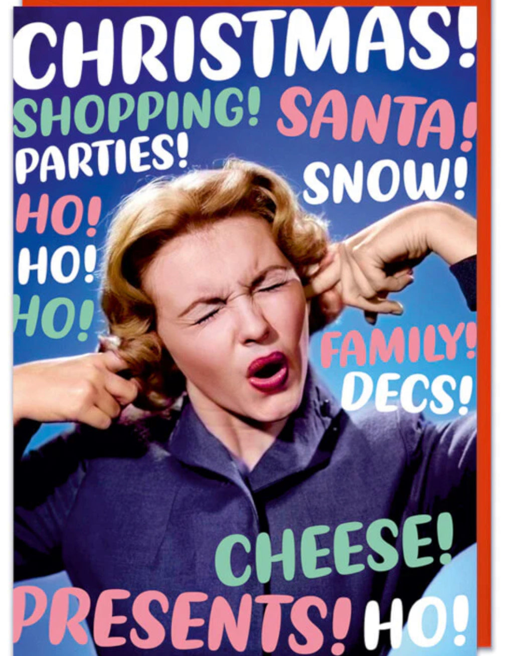 A Christmas card with a retro picture of a woman with her fingers in her ears. She is surrounded by rounded pastel coloured text that reads Christmas, Shopping, Parties, Snow, Family, Decs etc.