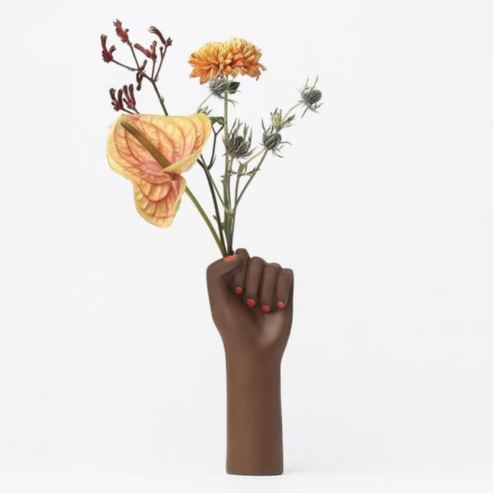Modern ceramic vase with matt finishing shaped as a fighting womans hand, with painted red nails. A symbol of resilience, bravery and strength. Material: Ceramic Size: 12.9x10.7x27.1cm Colour: Brown