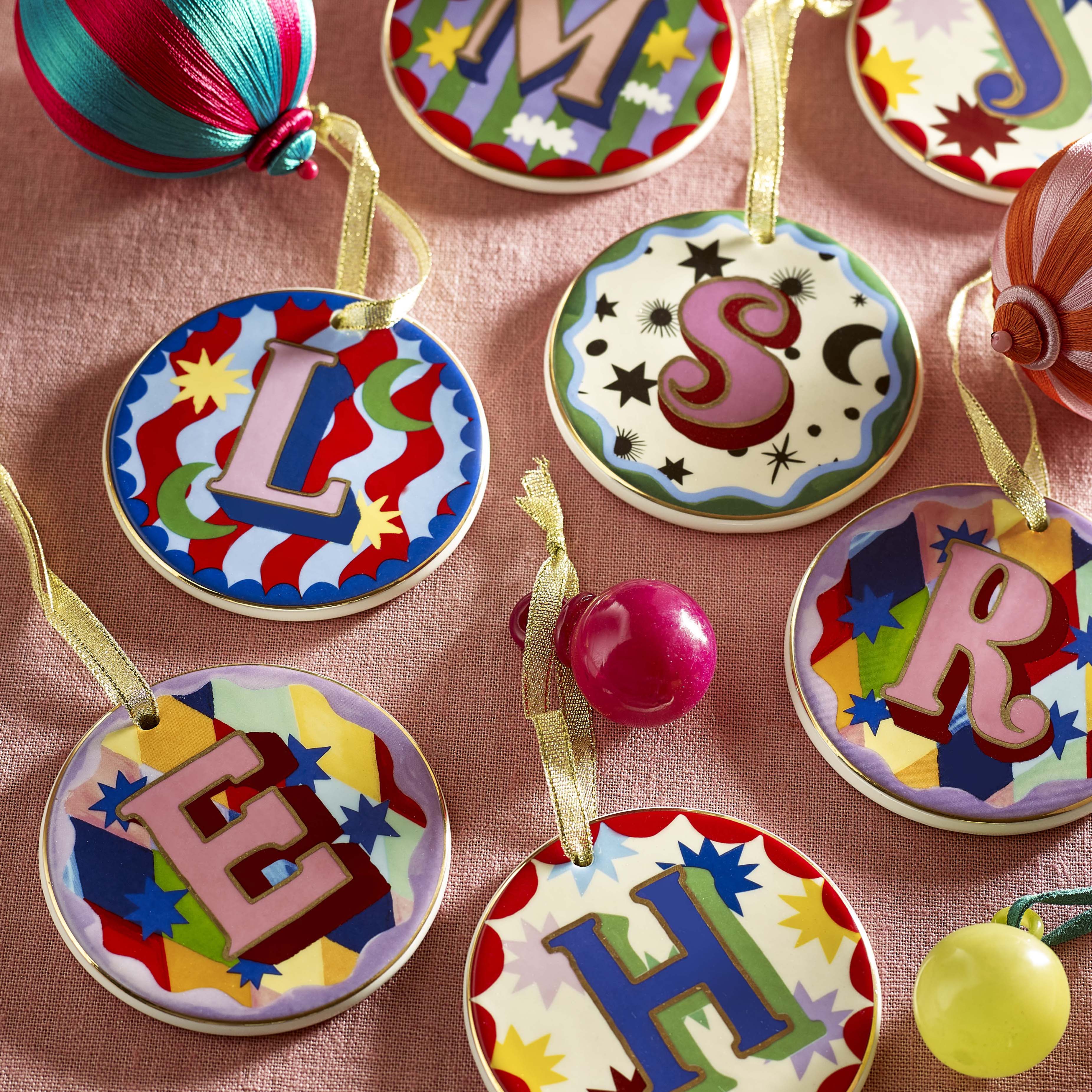 Add a personal touch to your Christmas tree with our Alphabet Bauble - a joyful ceramic disc featuring a bold initial, strung on a gold grosgrain ribbon. Whether it's your own letter or part of a festive word, it’s a charming keepsake, perfect as a gift, stocking filler, or luxury gift tag!