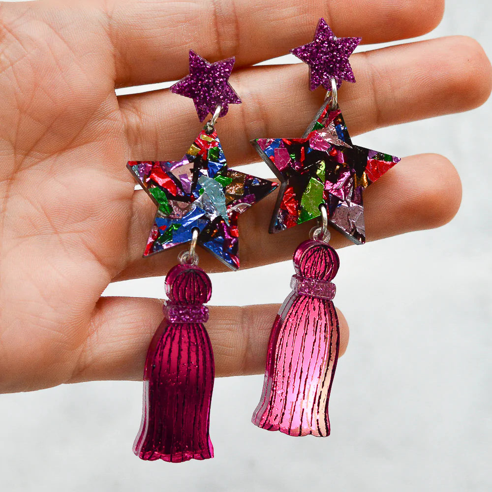 The purple star tassel earrings have a gorgeous pink and purple marbled acrylic.
