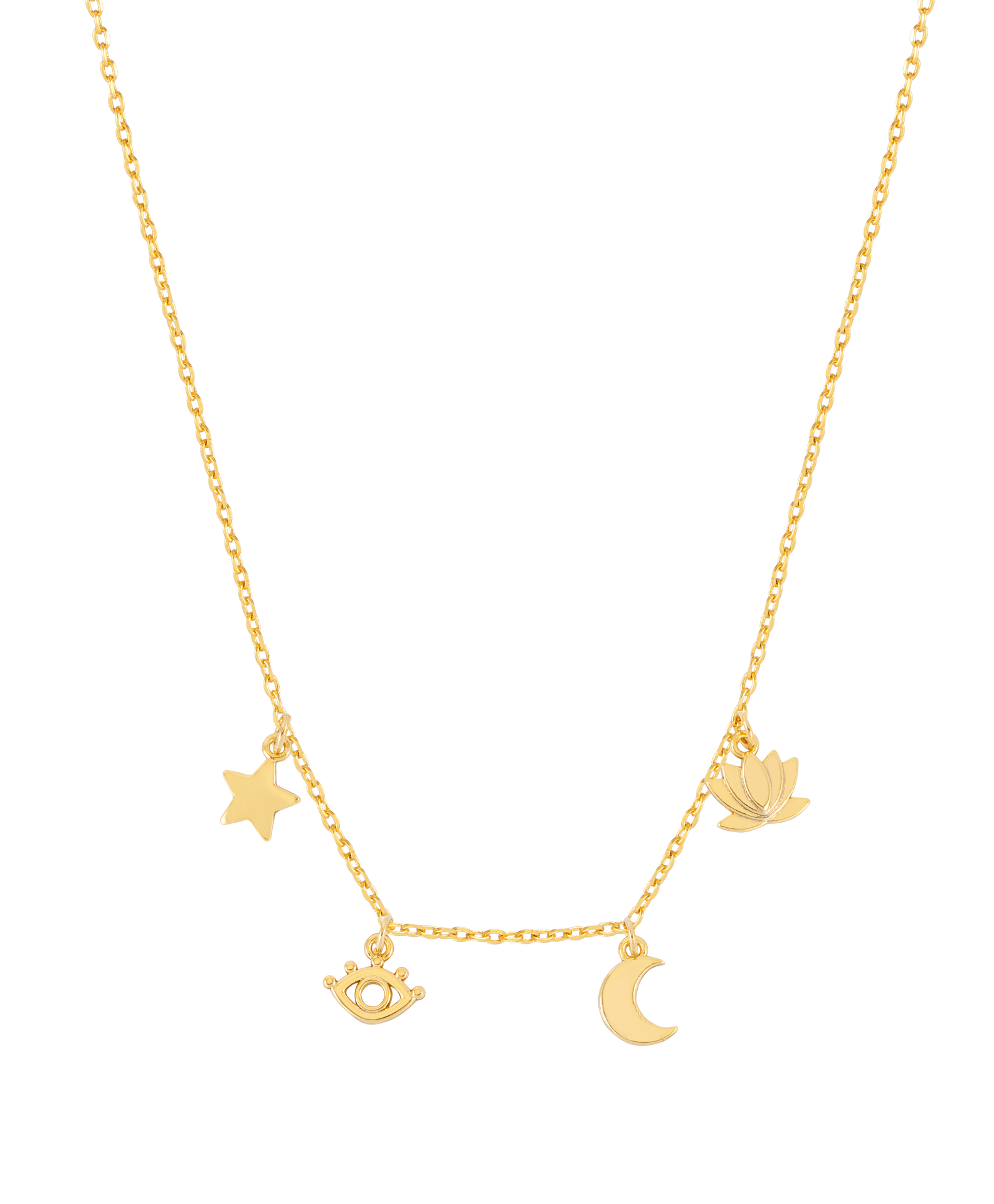 This Estella Bartlett necklace features an enchanting evil eye, moon, and stars charm. Crafted with precision and quality, this necklace adds a touch of mystical beauty to any outfit. Protect yourself from negative energy with this thoughtfully designed piece.