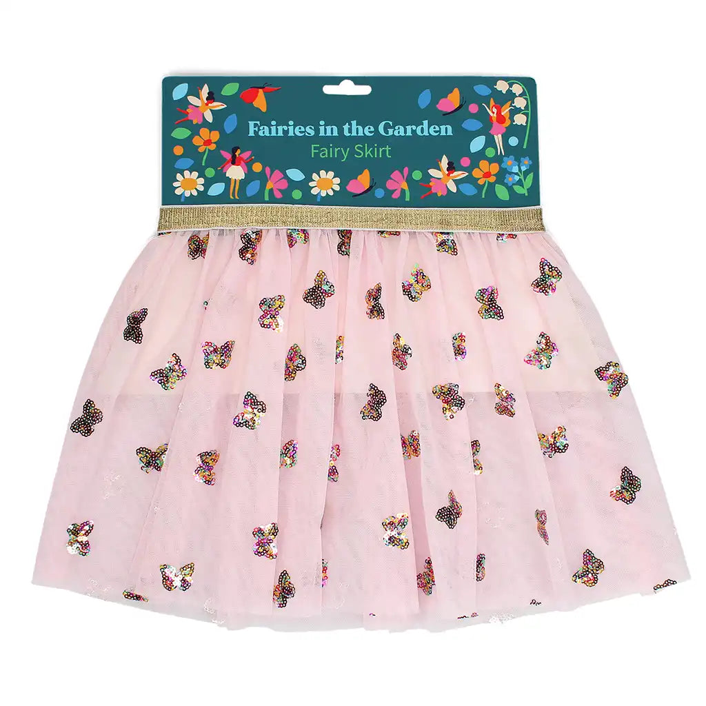 A fairy skirt for children, in pink, decorated with sequin butterflies and gold glitter on the waistband. Ideal for fancy dress or role play. Part of our Fairies in the Garden collection.