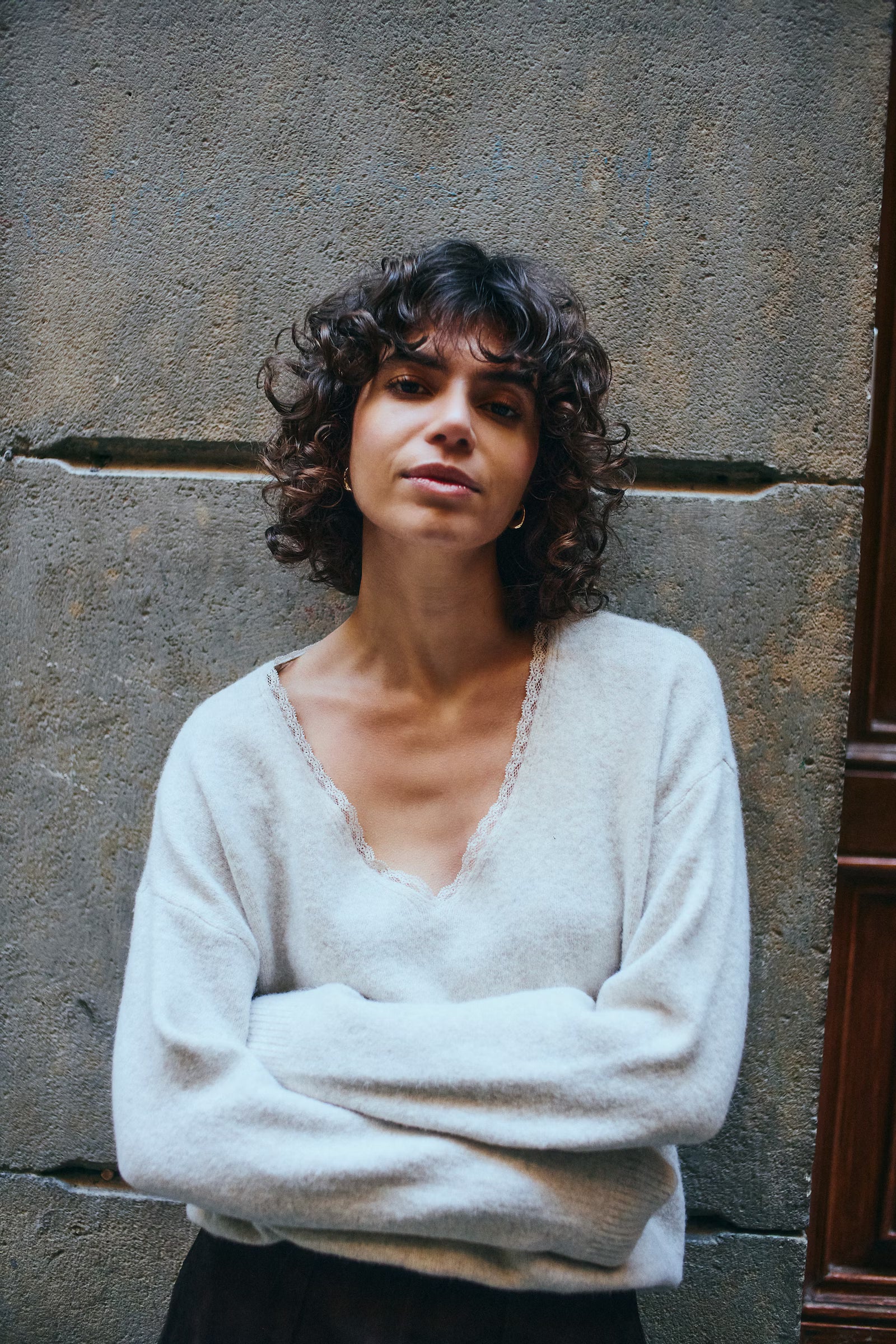 This women's V-neck sweater in Oatmeal Melange features a relaxed fit, long sleeves, and ribbed hems. Soft and comfortable, it’s ideal for effortless, everyday style with a subtle lace neckline detail.