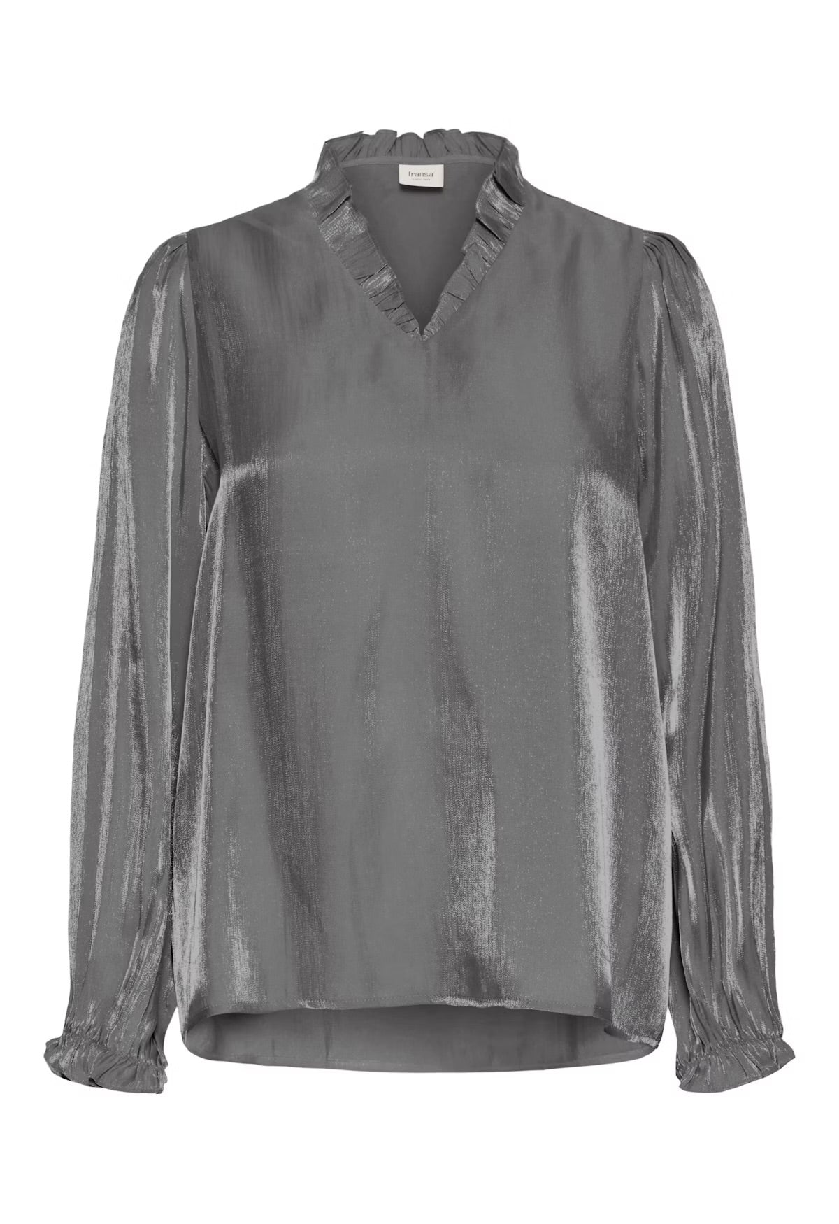 Shimmer blouse with subtle sheen, featuring long sleeves, ruffled V-neckline, gently gathered cuffs, and straight, relaxed silhouette for a chic touch.