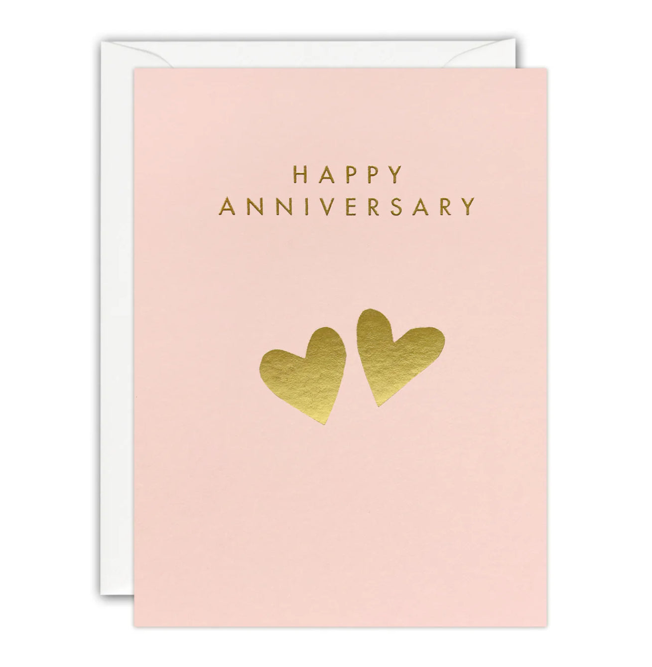 A high quality anniversary card illustrated by Linda Tordoff. The image on the front of the card features two gold foiled hearts on a warm pink background.