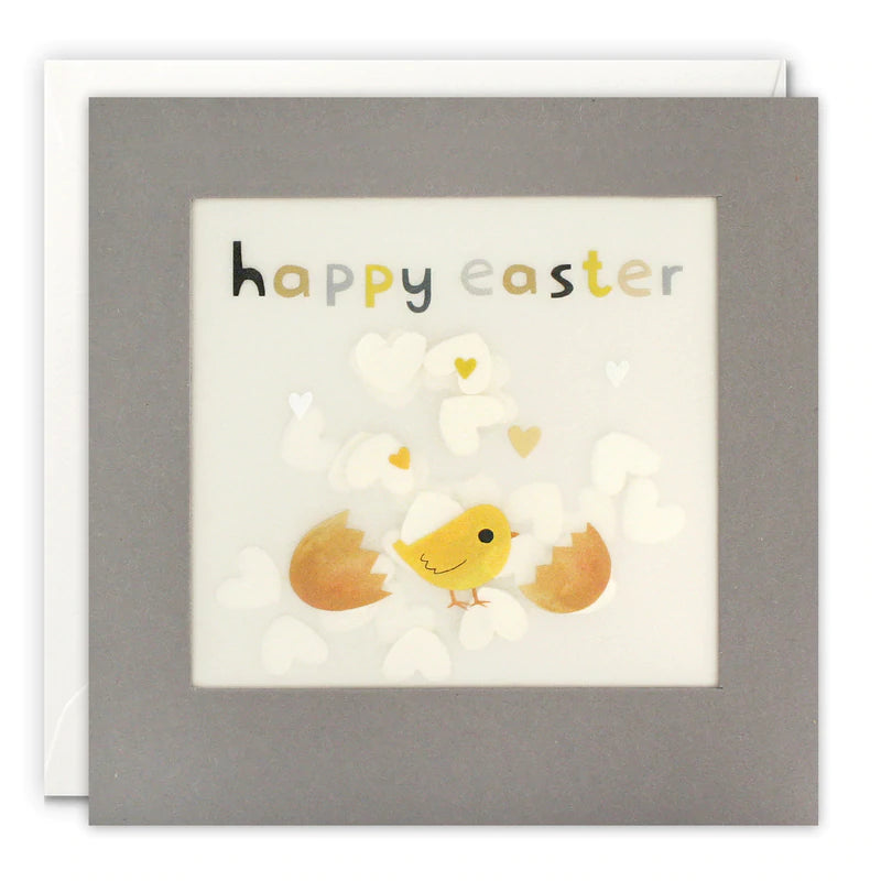 A pack of five high quality Easter cards illustrated by Klara Hawkins and printed on textured cream board. The image features a pattern of hens, chicks and sprint flowers on a yellow background. The text on the front of the cards reads 'Happy Easter'.