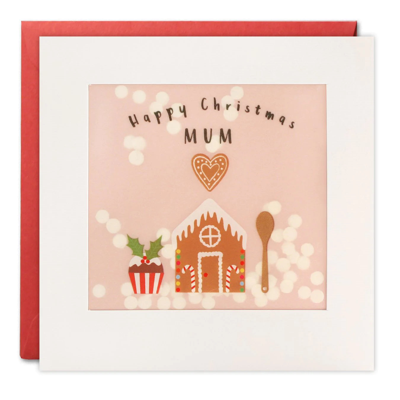 The text on the front of the card reads 'Happy Christmas Mum'. The message inside reads 'Sending you love at Christmas'.