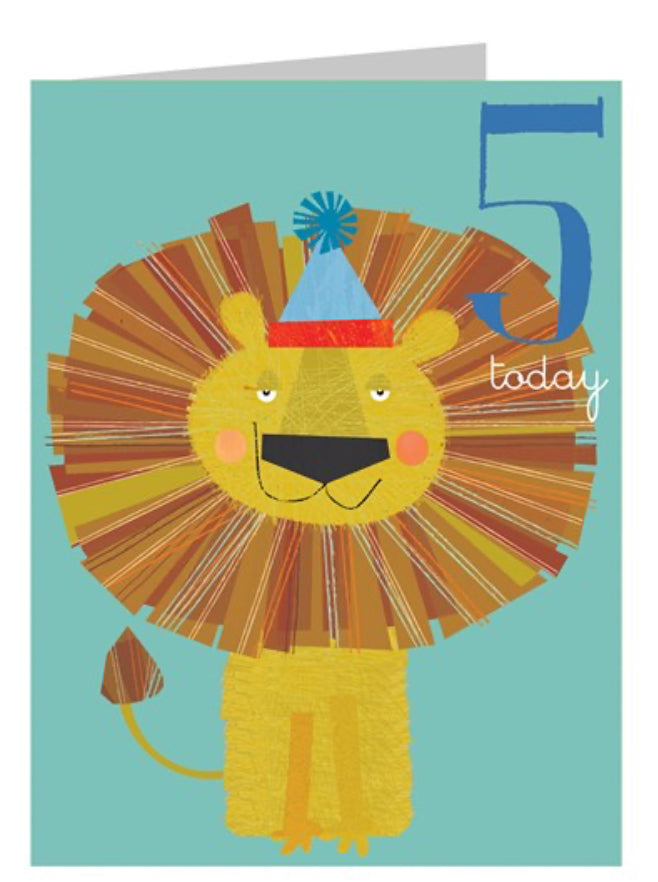 A lion with a lush mane and pompom party hat ‘5 today’ card on a teal background.