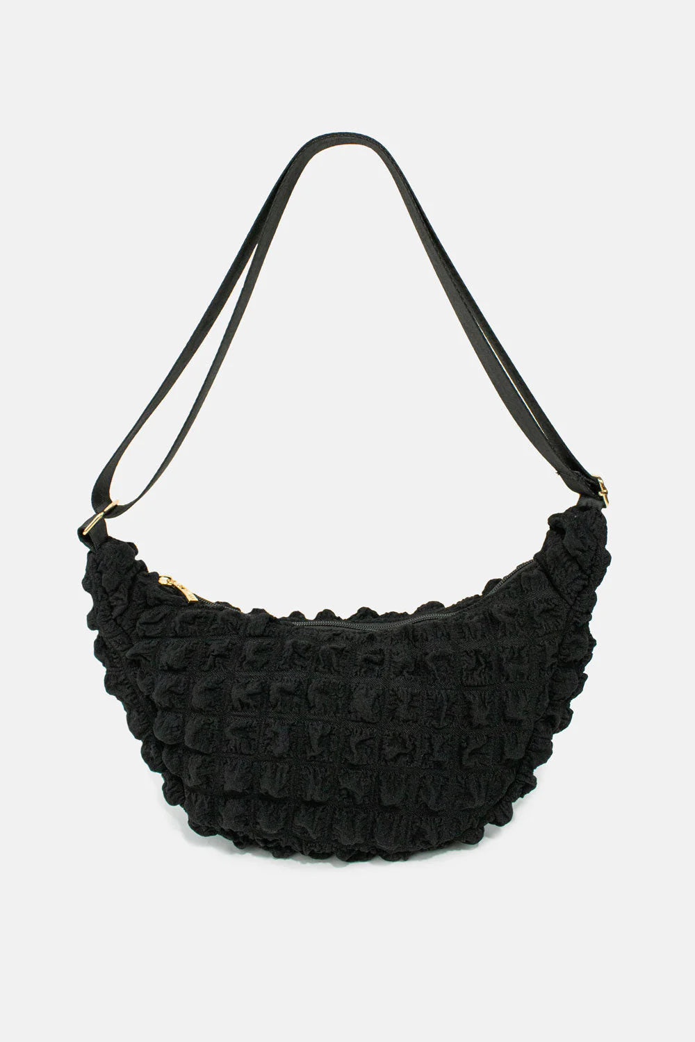 Compact crossbody bag made from 100% recycled materials. Features adjustable strap and multiple pockets for organization. Versatile design can be worn as handbag or crossbody for hands-free convenience.