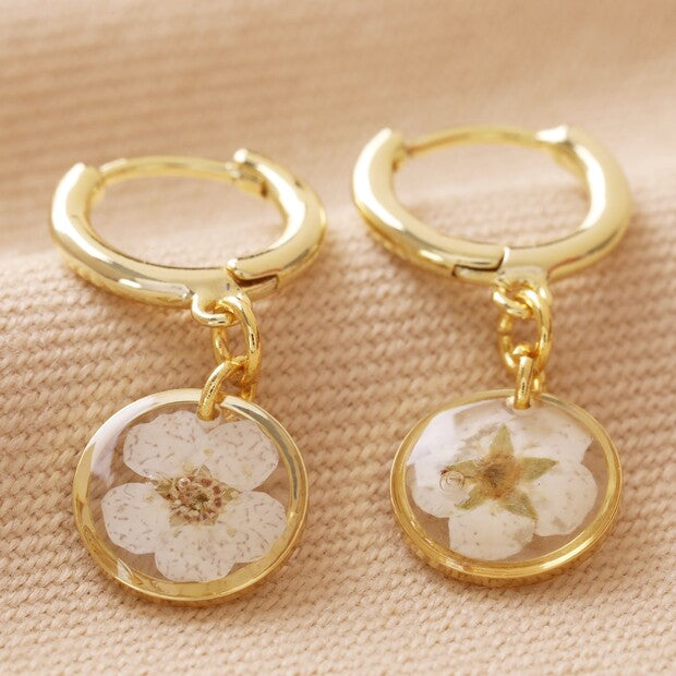 these dainty huggies suspend a gorgeous dried flower of your choice encased in a resin pendant. The perfect way to add colour to your every day, these stunning earrings are perfect for wearing stacked alongside other gold hoops and studs. With a choice of 12 blooms representing each birth month, each pair is unique due to our use of natural florals. Perfect for lovers of colourful accessories, these hoops would make a great gift for lovers of jewellery with meaning!