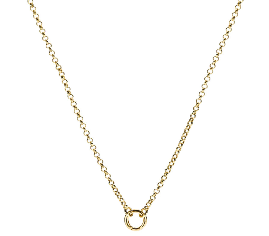 The Moments Rolo Charm Necklace is crafted from 14 Kt gold plated stainless steel and features a clasp designed for easily adding charms. Its long length offers versatile styling options for any occasion.