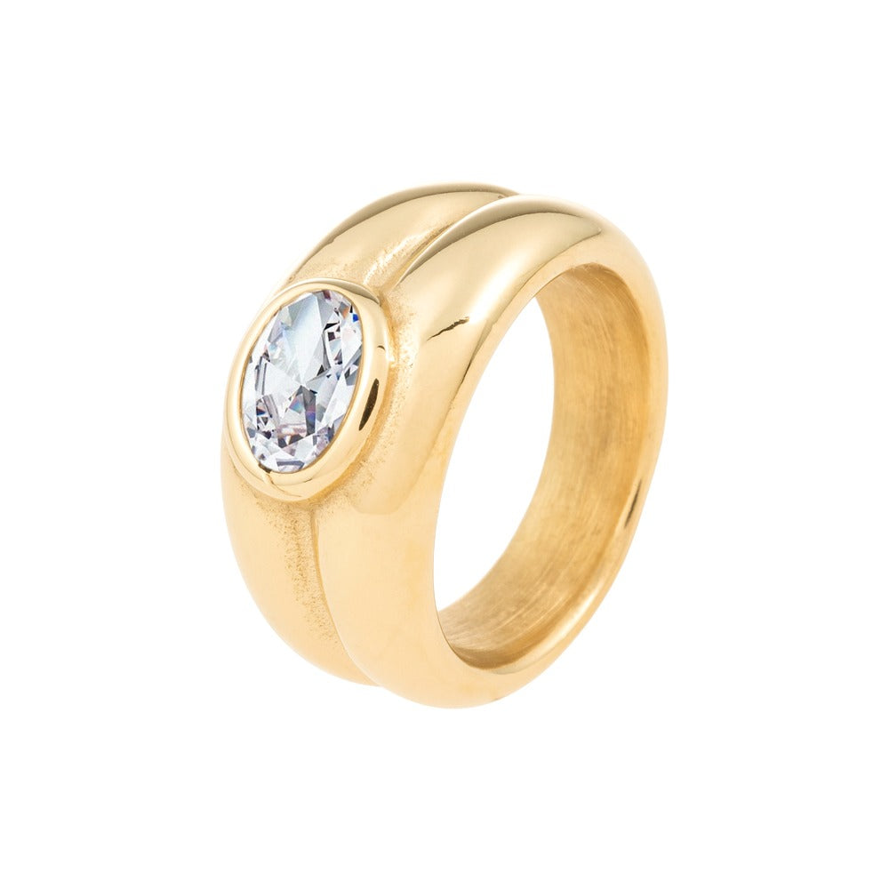 This Moments Lara Ring features durable 14 Kt gold-plated stainless steel and sparkling white cubic zirconia, combining lasting quality with elegant shine.