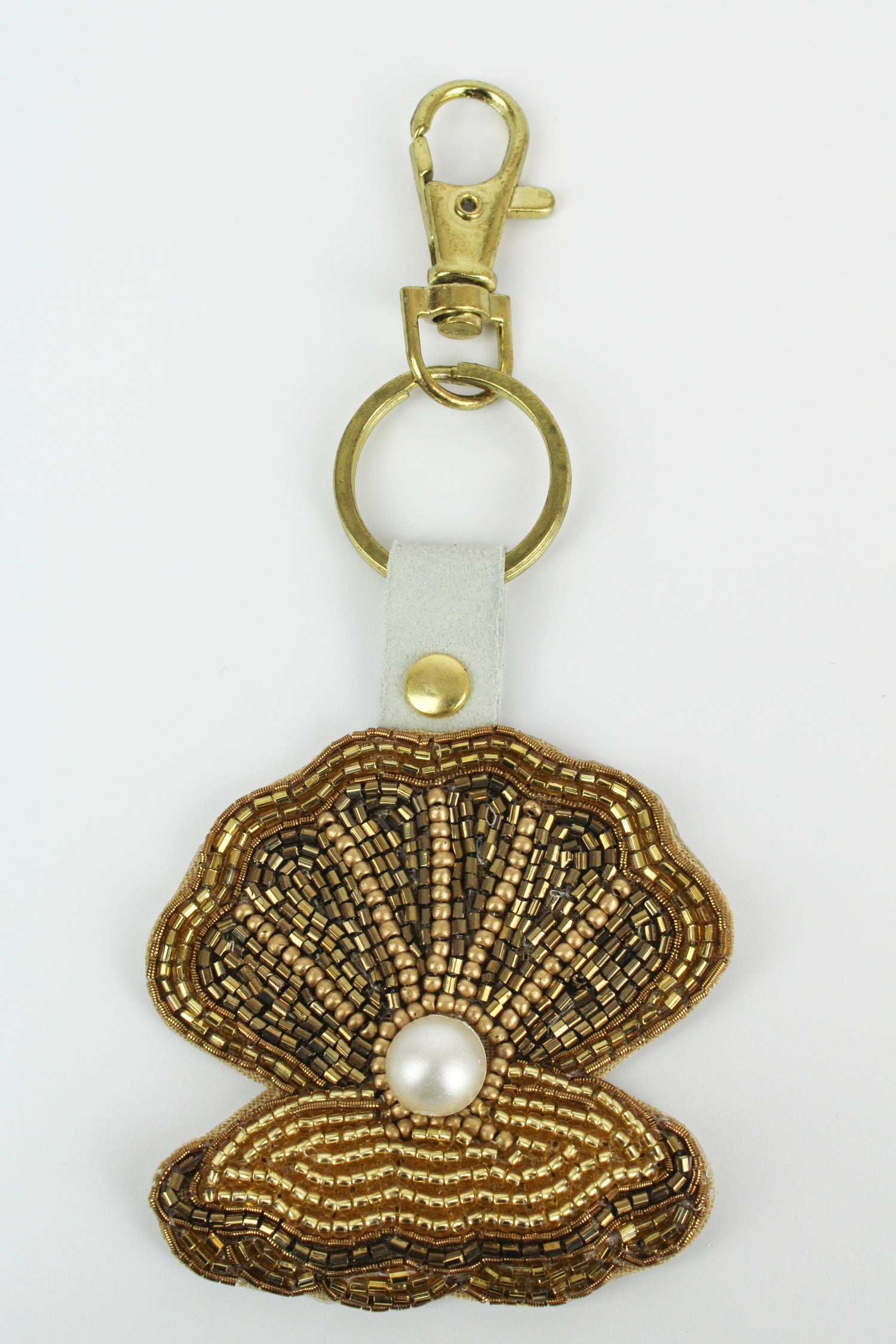 Best selling beadwork - statement gold clam keyring with a suede back.