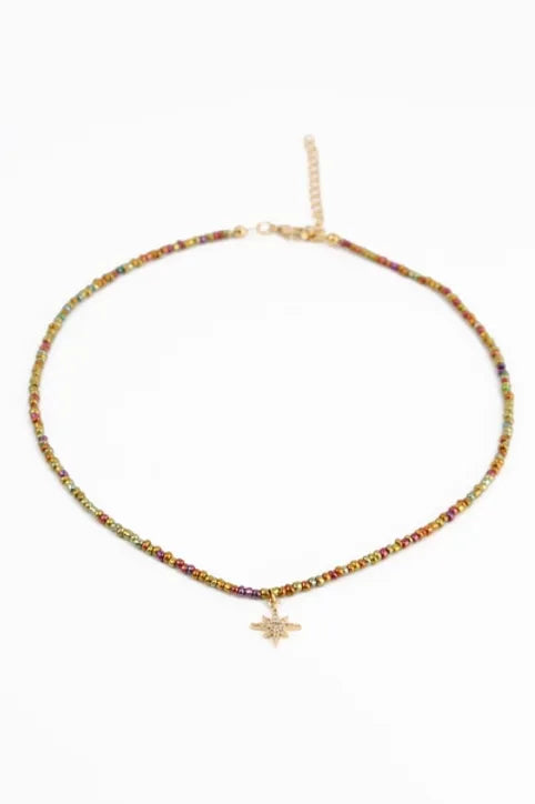 Beautiful crystal star necklace featuring shiny beads in gorgeous autumnal colours. Handmade by talented artisans in Turkey. Featuring glass beads and a 24ct gold plated charm with CZ detail. Length of necklace approximately 390mm with a 50mm extender. Star charm approximately 10mm in diameter.