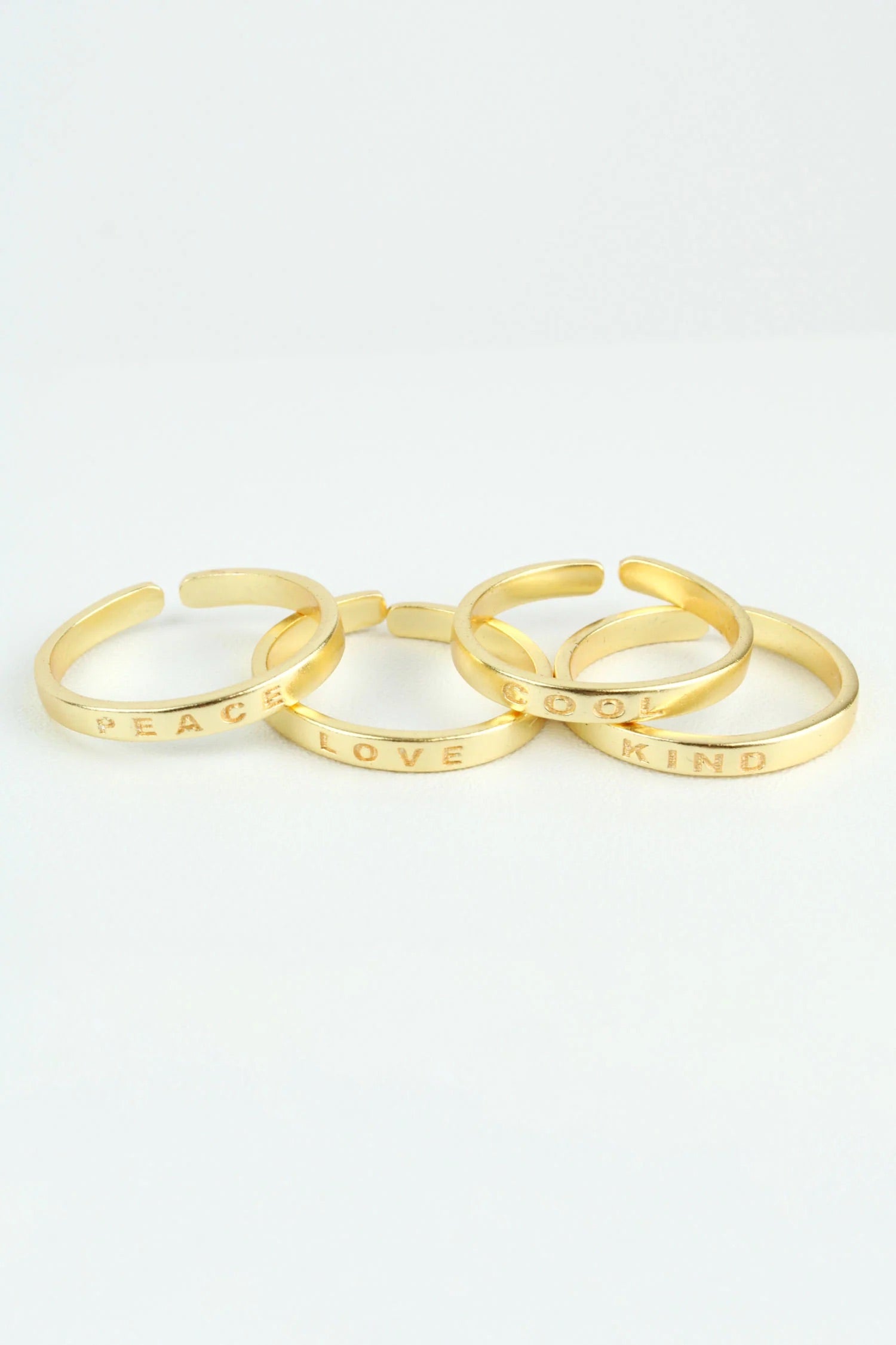 Gold plated adjustable band rings with: 'peace, love, cool, & kind' stamped quotes.