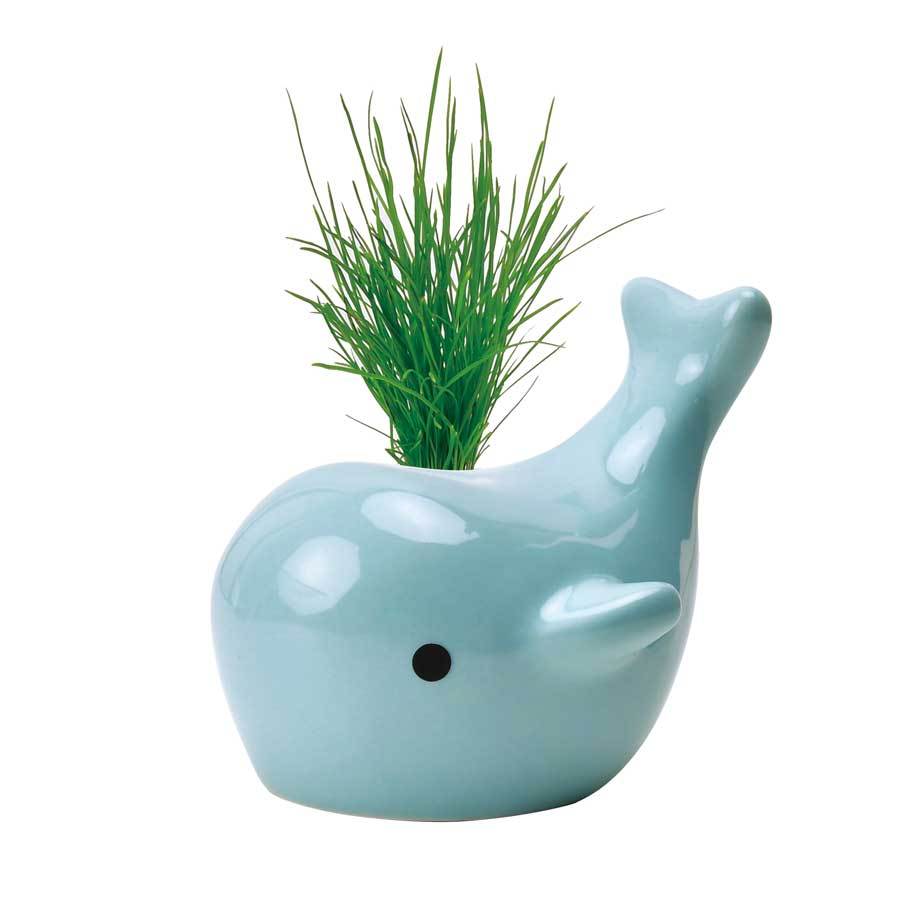 A Whale of a Good (Growing) Time! Here’s a whale who happily spouts sprouts! Made of glazed ceramic filled with fabric plug and seeds inside (no planting required!) just gently spoon a little water into the whale’s blow hole and place whale on a tray with a little water. Place in a sunny spot, plug absorbs water for seeds and “there she blows!” — green grass sprouts! Once the grass grow long, trim it and watch it grow again. After your done growing, the whale can be used as a pen or pencil holder. Happy Whale is just good, clean growing fun!