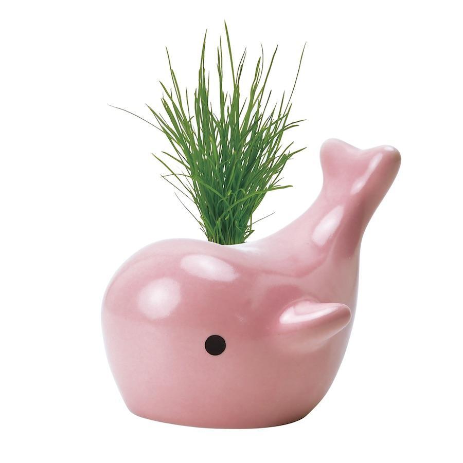 A Whale of a Good (Growing) Time! Here’s a whale who happily spouts sprouts! Made of glazed ceramic filled with fabric plug and seeds inside (no planting required!) just gently spoon a little water into the whale’s blow hole and place whale on a tray with a little water. Place in a sunny spot, plug absorbs water for seeds and “there she blows!” — green grass sprouts! Once the grass grow long, trim it and watch it grow again. After your done growing, the whale can be used as a pen or pencil holder. Happy Whale is just good, clean growing fun!