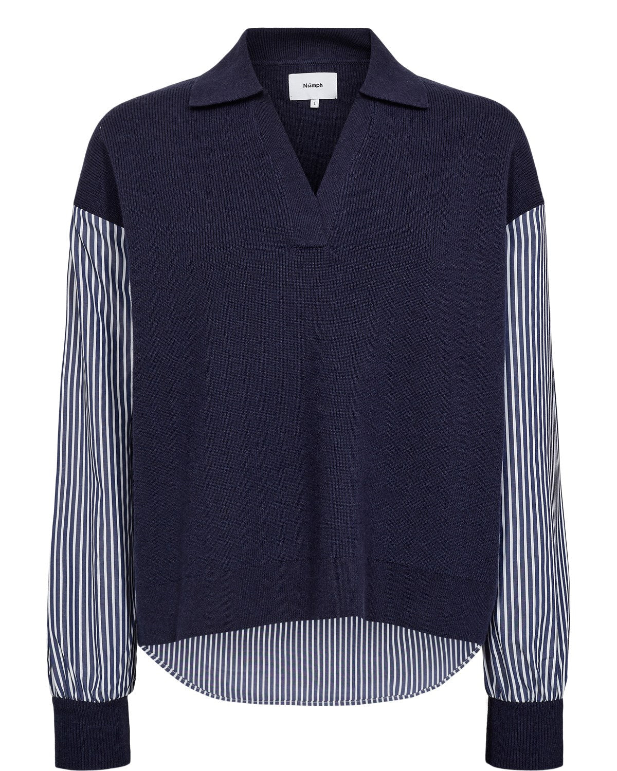 Navy pullover featuring pinstripe sleeves, pairs perfectly with jeans for a casual, yet stylish outfit