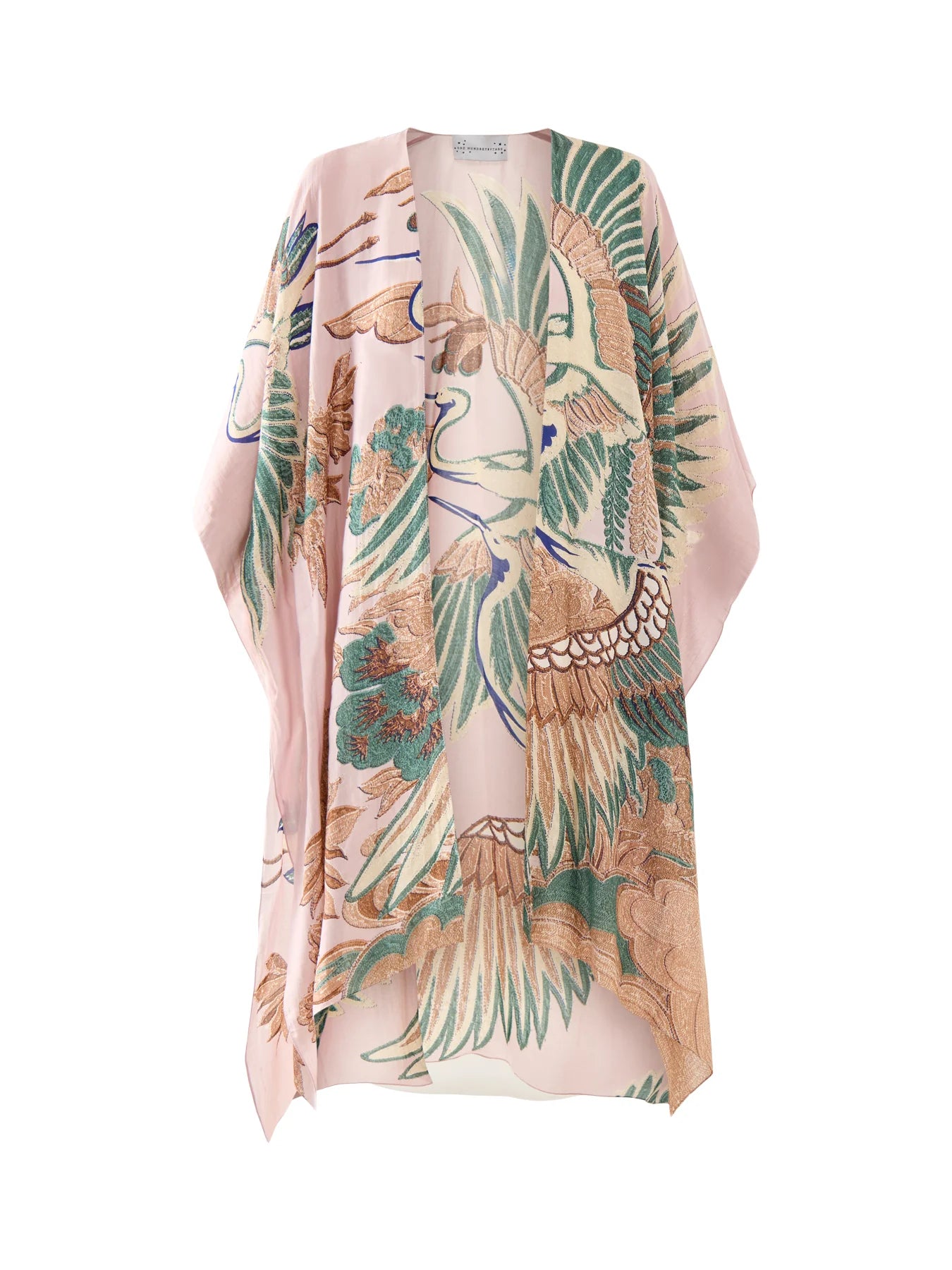 These large, graceful birds in jade, stone and camel colours fly across our signature plaster pink base.