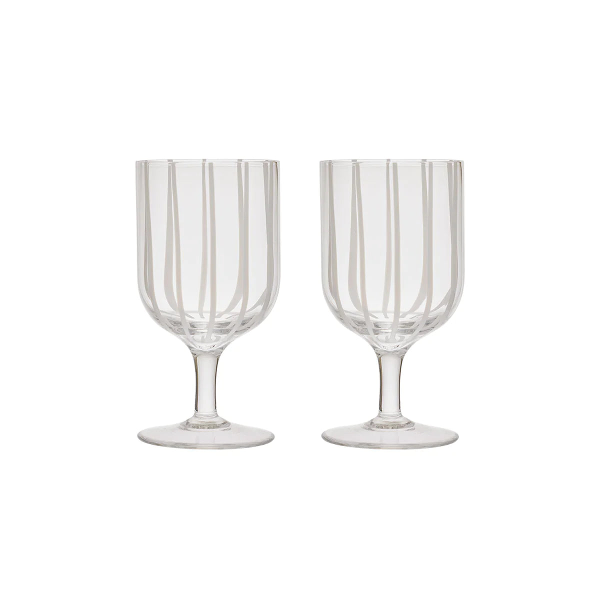 The Mizu series is characterized by an elegant, graceful and modern expression that fits well into the modern home. With its white stripes, the wineglass gets a playful expression. The wine glass short stem, which is combined with the large glass, is very suitable on a beautiful table. Each glass is unique as it is mouth blown, and with handmade details. The Mizu Wine Glass comes in a set of two.The wine glass has a volume of 350 ml.Dishwasher safe.Style no. L300546 Color: Clear Material: 100% Glass Dimensions: Ø7,7 x H15 cm Suitable for dishwasher and microwave. For more information on food contact material and declarations on conformity, please use this link: https://oyoy.presscloud.com/digitalshowroom/#/gallery/Compliance