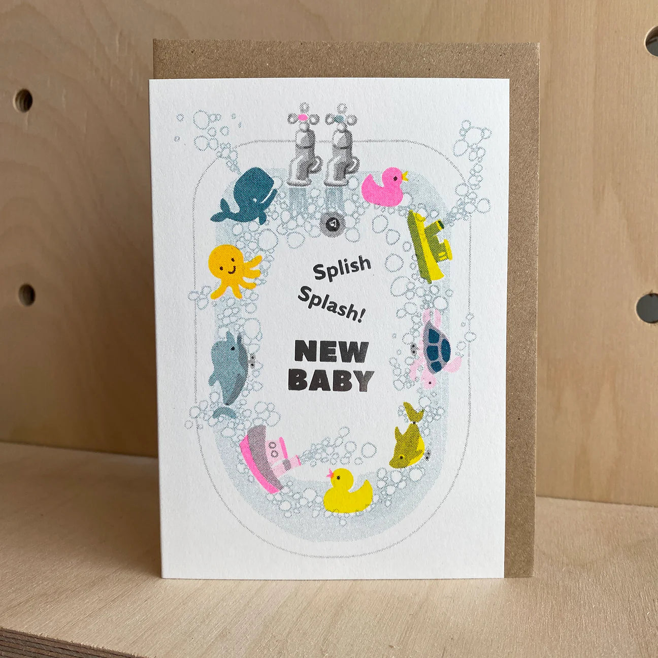 This Baby 'Splish Splash' greeting card is a unique Risograph print using soy based inks.