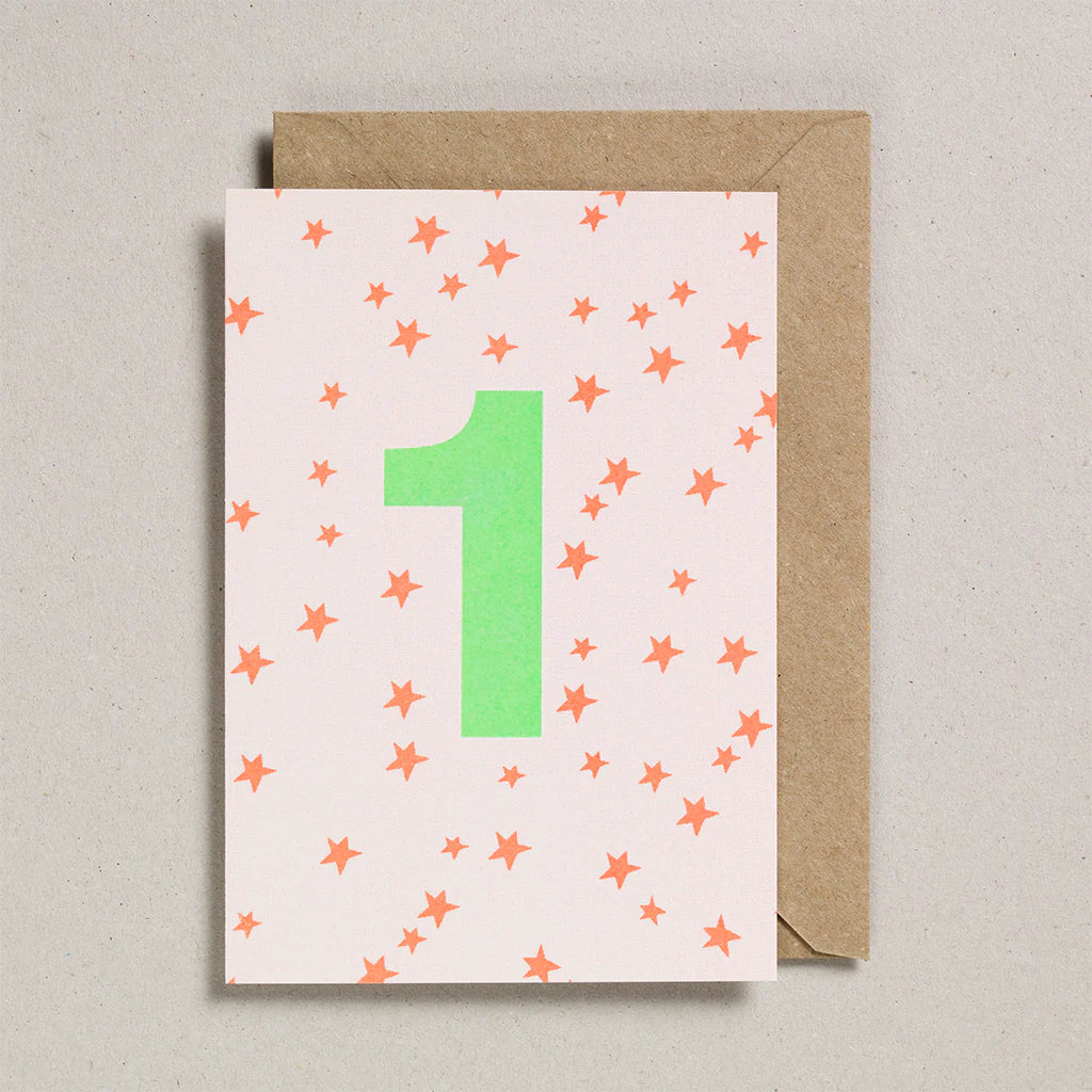 This fluoescent Birthday Age '1' greeting card is a unique Risograph print using soy based inks. Blank inside for your own message.
