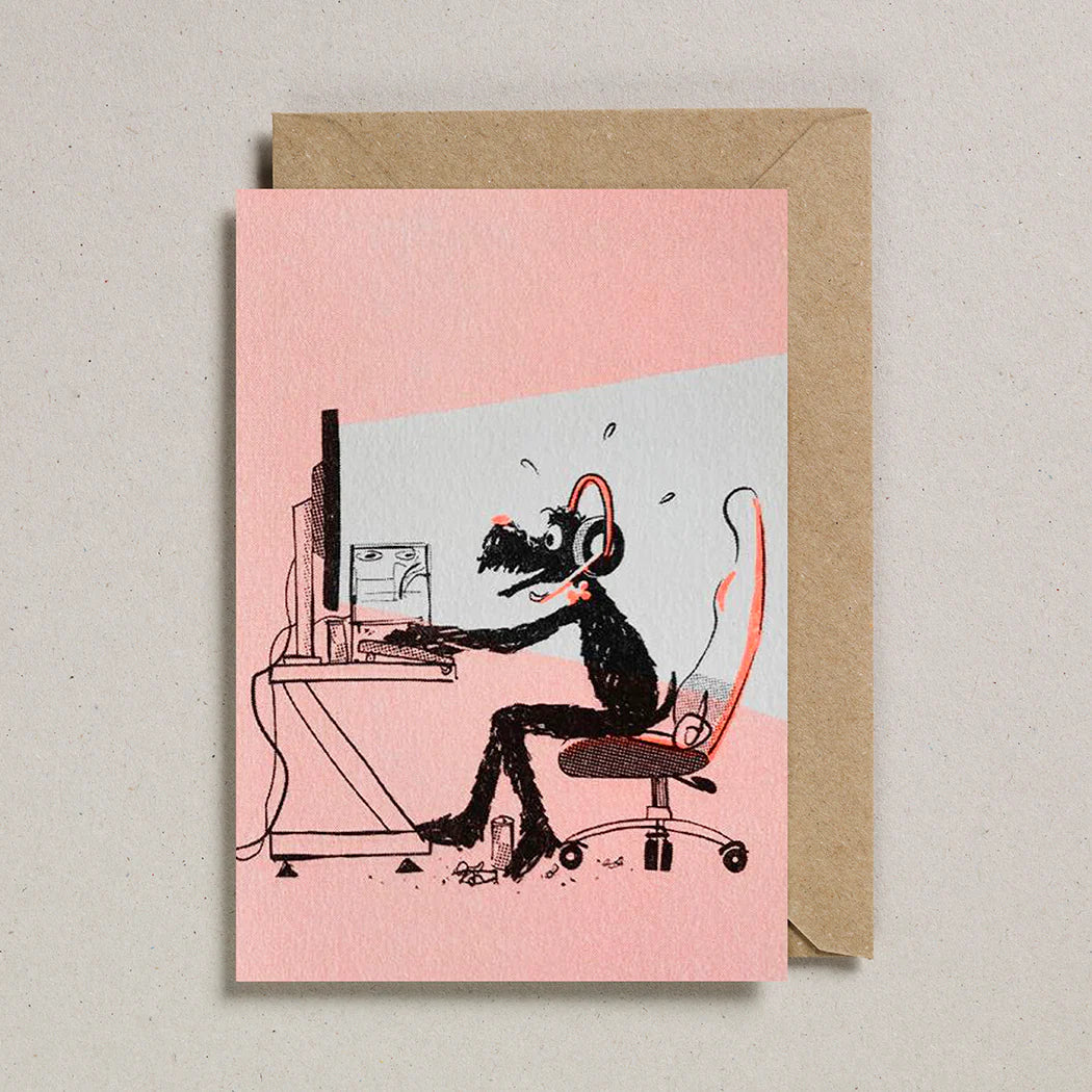Illustrated by Rusty Studio, this Rascals 'Gamer Dog' riso print greeting card is inspired by vintage annuals and comics. Printed on the studio risograph machine using soy based inks.