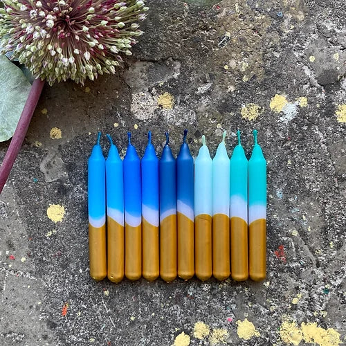 Set of ten lovingly hand-colored tree candles with a gold look. The colors remain the same, the patterns vary with each candle and make them special and unique.