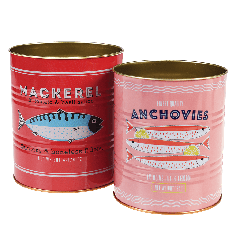 Two retro style storage tins with a fish design.