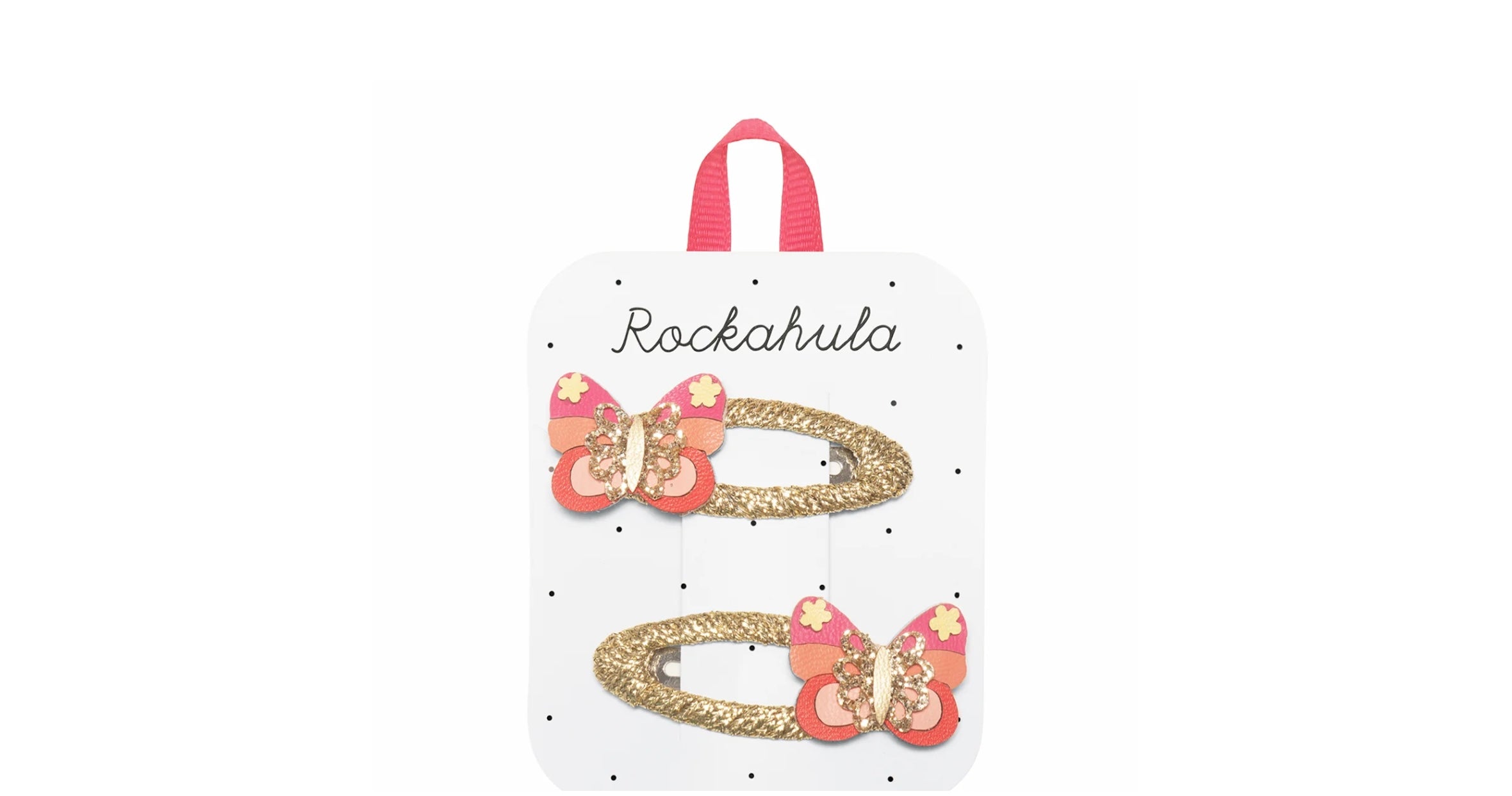 Flutter like a butterfly with these bright and bold butterfly clips, with hues of pink faux-leather and shimmering gold details, secured upon gold grosgrain ribbon wrapped snap clips. Perfect for creating magical moments!