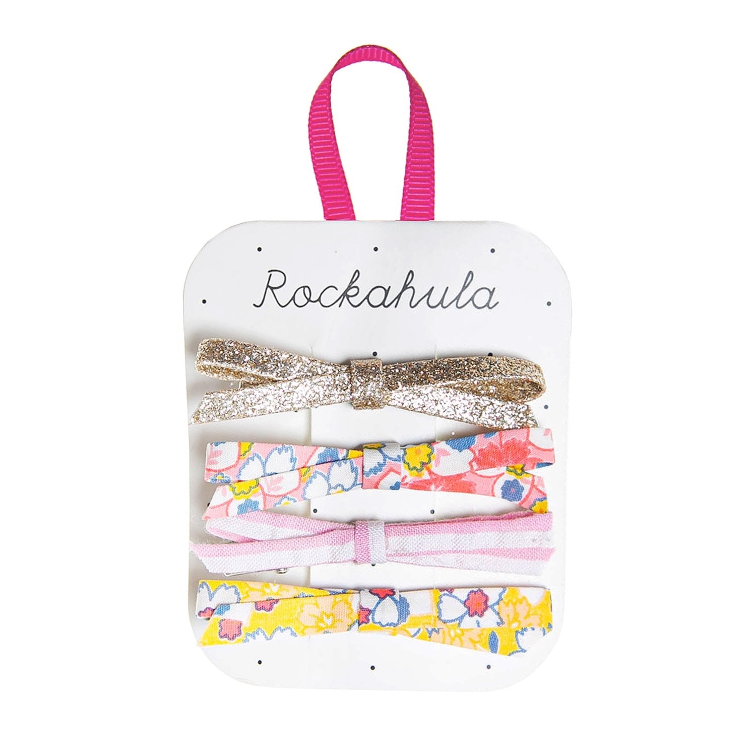 Mix and match your bows with this pack of four beautiful clips. Made from an array of co-ordinating fabrics including a gold glitter, our beautiful blossom print, a neutral spot and a pretty pink fabric. Wear them one at a time - or all at once!