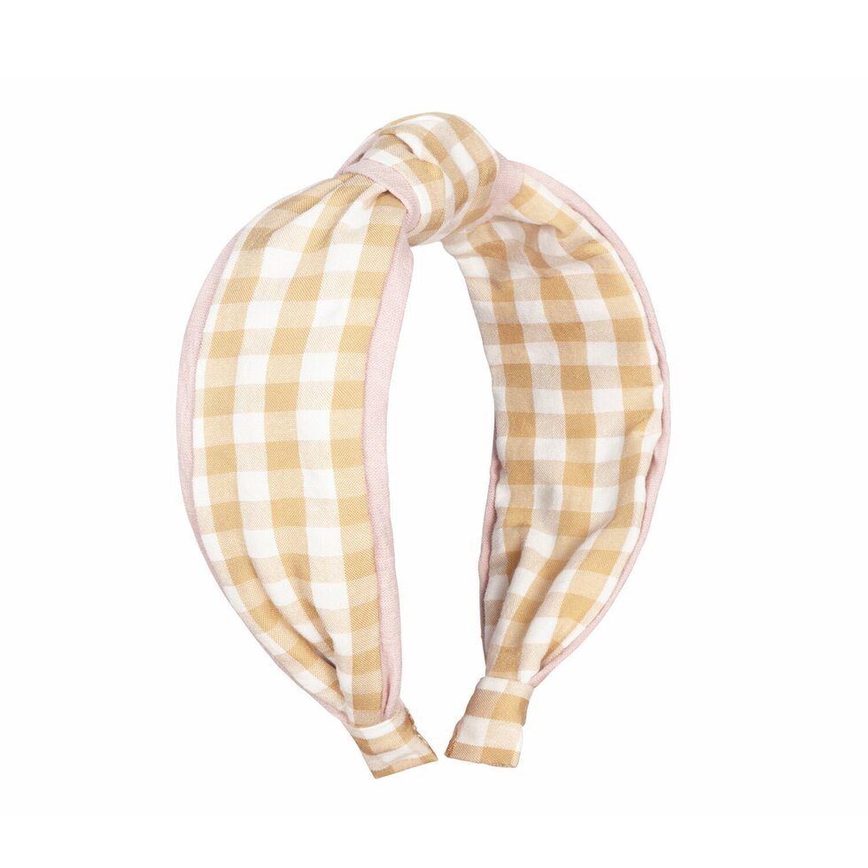 Our gingham headband is made from the softest ochre gingham fabric, and is edged with a soft dusky pink fabric. It features a twisted knot and is made for a comfortable fit for little heads!