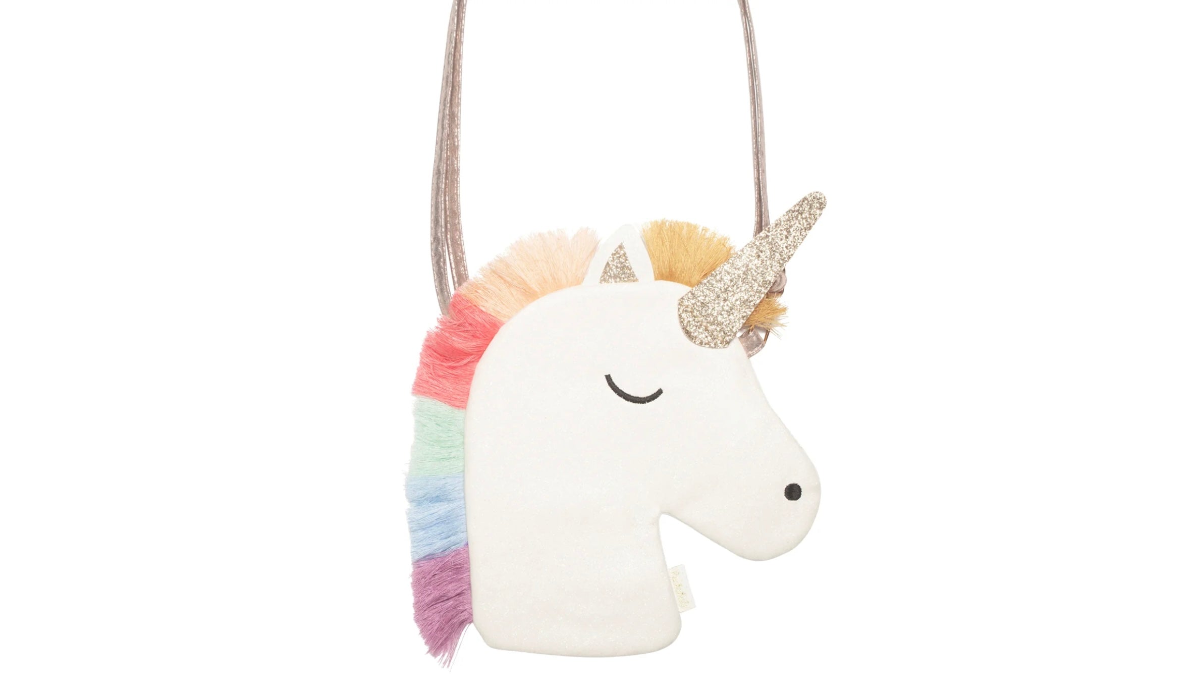 We believe in unicorns, and so can you! Our rainbow unicorn bag is made from super soft white glitter with a brightly coloured rainbow mane and a glittery gold horn. This bag features a magnetic dot closure, gold starry lining and an adjustable gold strap with a break point for safety.