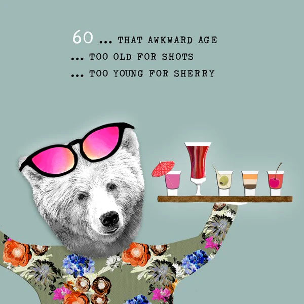Funny 60 Birthday card. '60 that awkward age. Too old for shots, too young for sherry'.