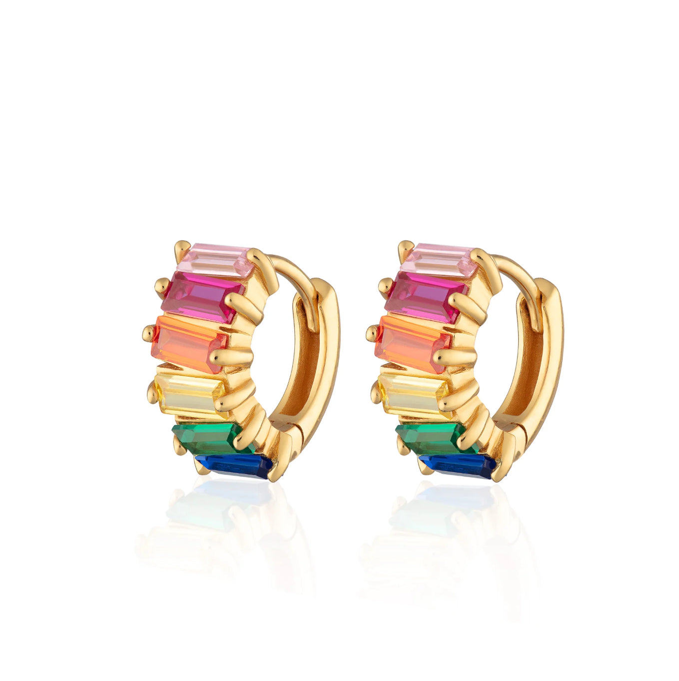 Dazzle in bold colours with these rainbow baguette huggie hoop earrings. Sold as a pair.