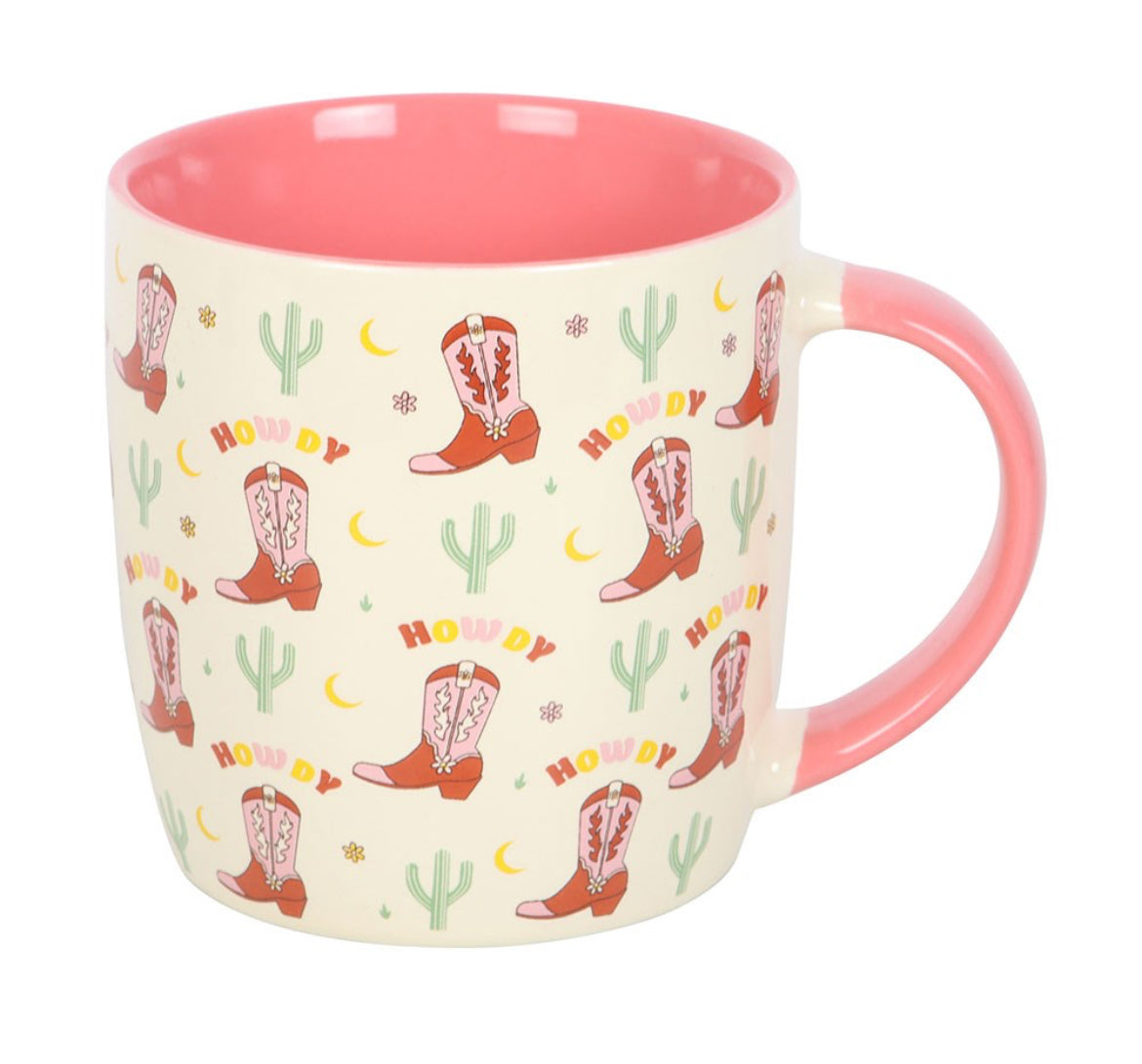 Sip your morning coffee with a bit of Western flair with this cowboy print ceramic mug. Featuring a cute cowboy boot print and a 'Howdy' greeting, this mug is perfect for those who love a touch of rodeo nostalgia.