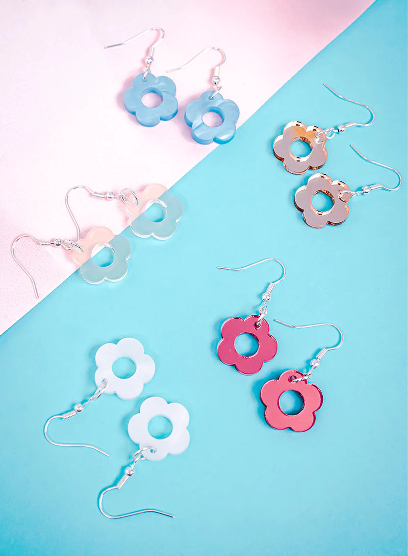 Embrace the botanical in our Flower Charm Earrings. With a nod to mod and Mary Quant’s 60s florals, we’ve laser cut a pair of cut-out flowers in five glistening shades of acrylic. The best of the bouquet, take your pick from pastel pearlescence with white or teal pearl or make mine mirror with rose gold or posey pink. Into iridescent? Glow from peach to lilac with buds blooming from hypoallergenic silver-tone hooks. Hop on the floral adornment trend with a pair of everyday floral jewellery.