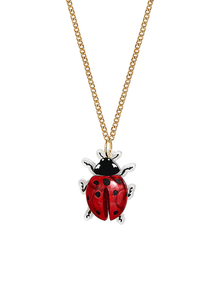 Animal accessories just got cuter, pop on our Ladybug Pendant. We’ve reimagined a luxe ladybird in layers of pearlescent red and recycled black and clear acrylic. Hand-curved by our expert makers, this 3-D insect necklace is complete with hand-inked statement spots. Suspended from an adjustable gold-plated chain, wear with autumn-toned turtlenecks.