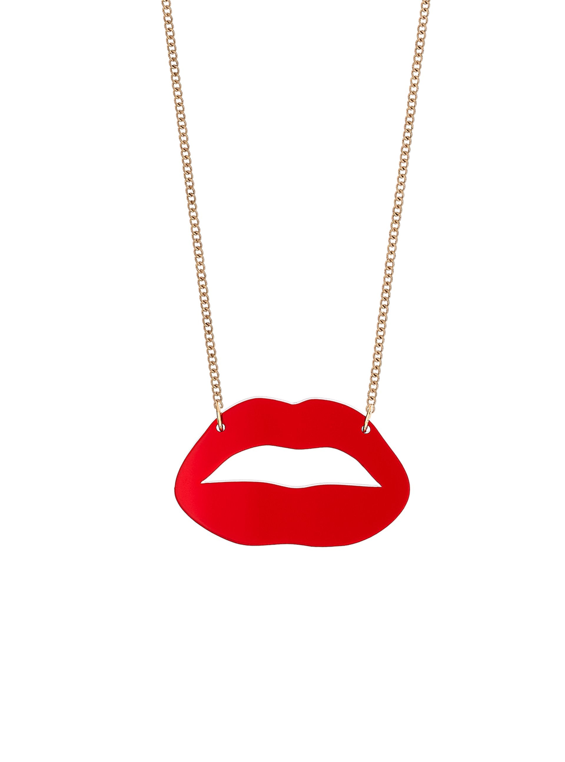 Strike a pose in the mirror red Lipstick Kiss Necklace. Tatty Devine has recreated a luscious pout in glossy mirror red acrylic, laser cut in their Kent studio and hand linked to a gold-tone chain by their team of talented beauticians, sorry, jewellery makers!
